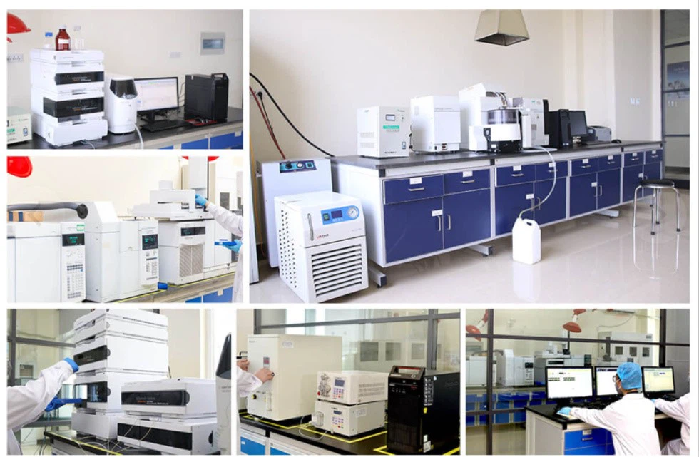 The standard quality inspection laboratory is equipped with two high-performance liquid chromatographs (HPLC), two ultraviolet spectrophotometers (UV), one atomic absorption spectrometer (AAS), one gas chromatograph (GC), a microwave moisture analyzer, and an ash content analyzer